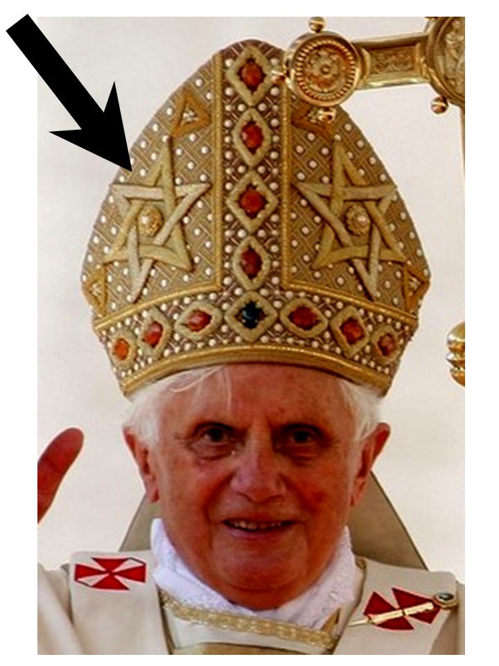 In October 2009 at a fake "canonization" ceremony of the vatican-2 cult, Ratzinger shows up wearing a mitre with an anti-Christ jew star on it. The jew star logo for the particular apostasy which goes by the brand name of "judaism" was adopted at the zionist conference in Switzerland in 1897.
